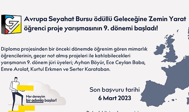 2022-2023 döneminde 9. kez düzenlenen Geleceğine Zemin Yarat, mimarlık bölümü lisans programı öğrencilerinin diploma projelerinden bir önceki projeleri ile katılabilecekleri, seyahat bursu ve gezi ödü...