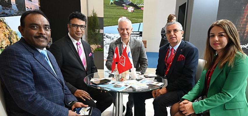 Universal Fedaration Of Travel Agents Association (UFTAA) Başkanı Sunil Kumar Rumalla, Travel Turkey İzmir Turizm Fuarı’nda Kemer standını ziyaret ederek, Kemer Belediye Başkanı Necati Topaloğlu’ndan Kemer hakkında bilgiler aldı