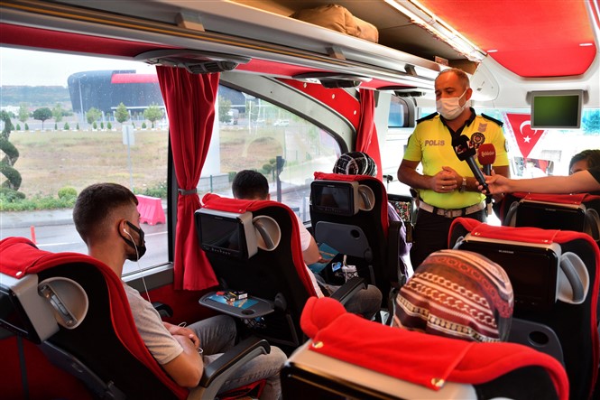 Ekipler, şehirlerarası otobüs sürücülerine alkol muayenesi yaptıktan sonra evraklarını inceledi. Yolcular da emniyet kemeri ve maske kullanımı konusunda denetlendi.