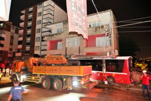 Çarpışmanın etkisi ile yoldan çıkan otobüs, bir markete girdikten sonra durdu.