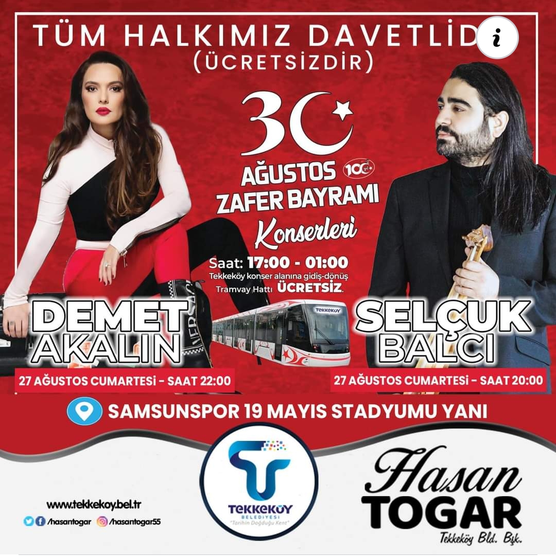 30 Ağustos Zafer Bayramımızın 100. Yıl coşkusunu, Karadeniz müziğinin özgün sesi selçuk BALCI ve Pop müziğin güçlü ismi Demet AKALIN ile birlikte 27 Ağustos Cumartesi 20.00’de Samsunspor Stadyumu yanındaki alanda düzenleyeceğimiz açık hava halk konserimizde kutlamaya tüm halkımız davetlidir.